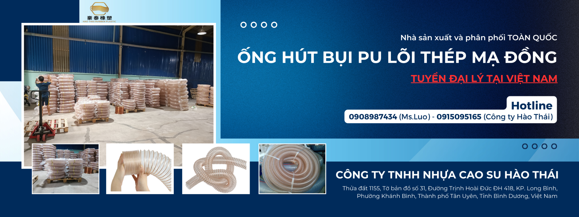 “CÔNG TY TNHH NHỰA CAO SU HÀO THÁI” là đơn vị sản xuất Ống hút bụi PU lõi thép mạ đồng – Ống hút bụi mềm đầu tiên tại Bình Dương – Việt Nam.